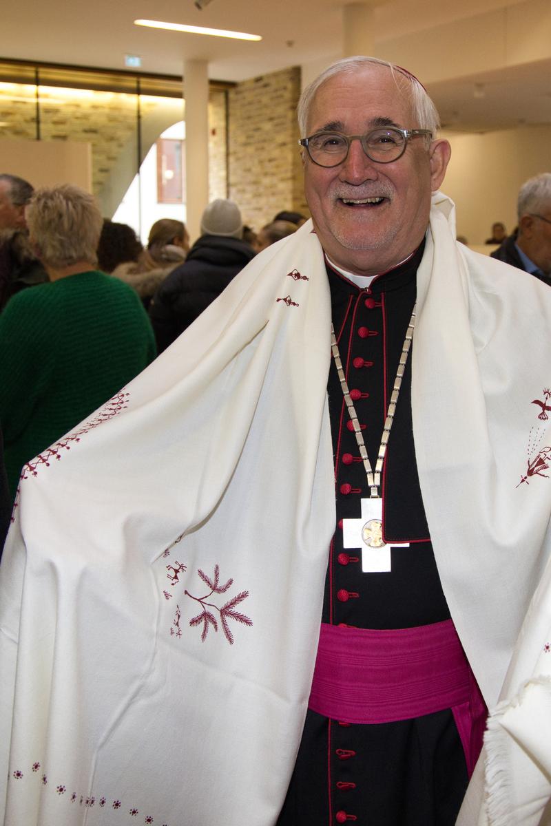 El sábado pasado, el obispo de Rottenburg-Stuttgart se despidió de su diócesis en un repleto oficio religioso y una digna celebración. El jueves anterior, el Vicepresidente Erik Thouet y el pequeño equipo de la oficina de CID, la Secretaria Brigitte Vogt y el Director General Jörg Stein, tuvieron la oportunidad de obsequiar al Obispo Gebhard con un regalo especial. El Vicepresidente Gilbert de Lima tenía un pañuelo diseñado por los adavasi, los habitantes originarios de la India. El obispo Gebhard se mostró visiblemente emocionado por este regalo exclusivo.