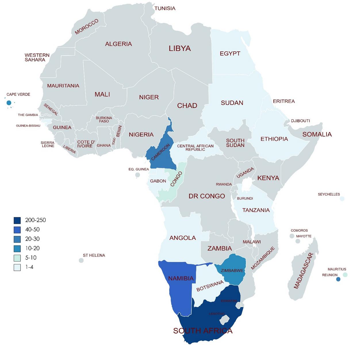 La situación sudafricana es anómala en comparación con el resto del continente, ya que el 58% de todos los diáconos permanentes de África se encuentran en este único país. Namibia es el siguiente país con mayor número de diáconos, con 49 hombres ordenados. Las cifras se reducen considerablemente, ya que algunos países tienen 1 ó 3 diáconos permanentes, y muchos no tienen ninguno, lo que implica que el diaconado permanente no se ha restaurado en estas iglesias locales, como demuestra el gráfico siguiente: